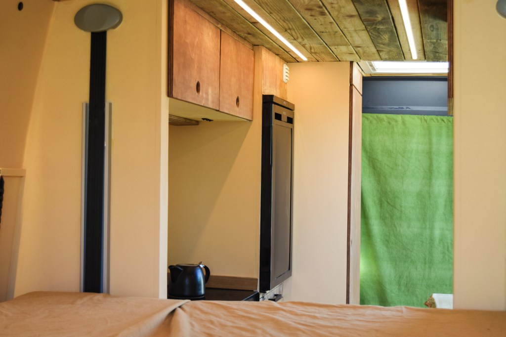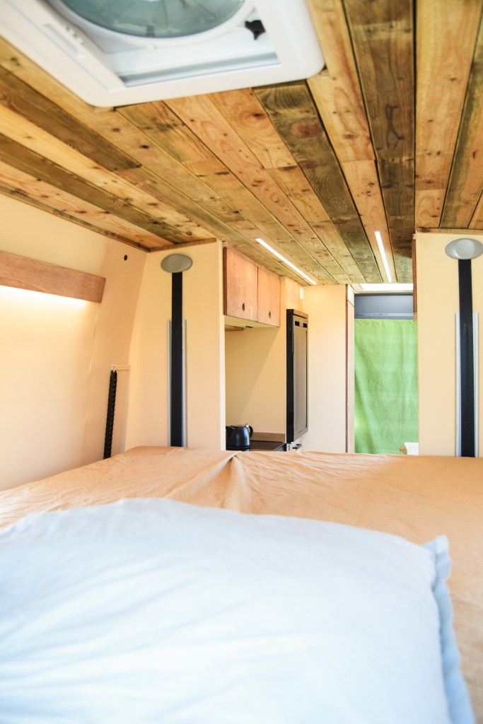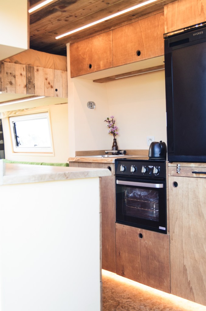 Deze campervan heeft enkele leuke features: een elektronisch hefbed om de ruimte optimaal te benutten, een kookvuur mét oven, een grote kleerkast voor wetsuits en zeer veel LED-verlichting!