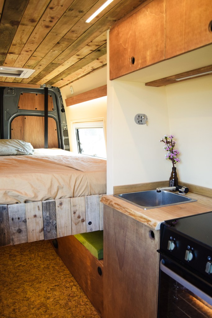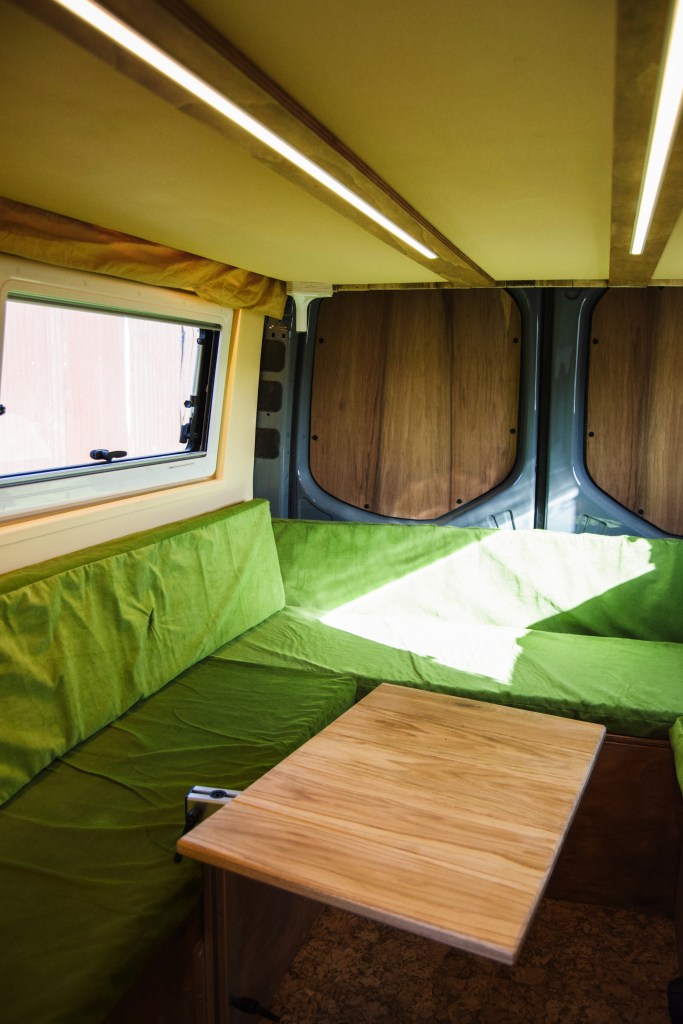 Deze Ford Transit bestelwagen bouwen we op ecologische wijze om tot full off-grid campervan. Compleet uitgerust met gasfornuis, gootsteen, uitschuifbaar tweepersoonsbed, verlichting, stopcontacten, dakvenster, ventilator, leefbatterij en nog veel meer! Dit alles vervaardigd uit onder andere gerecupereerd palettenhout en multiplexplaten. Safe travels!